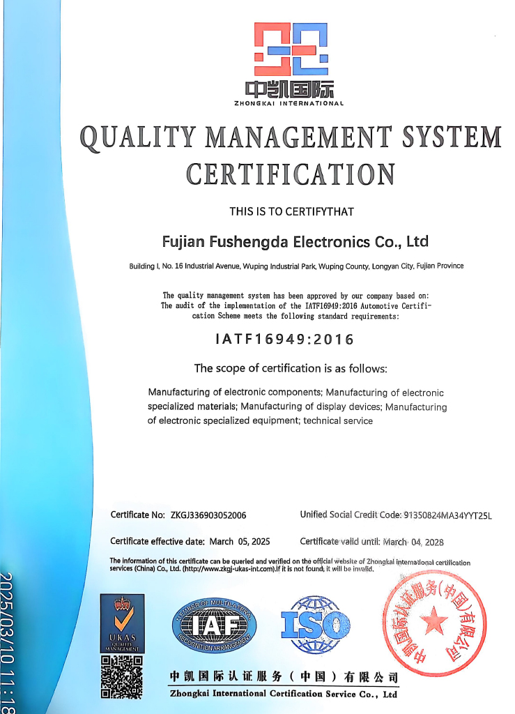 公司目前占地 25,000 平方米,其中包括一个 20,500 平方米的洁净室,该洁净室配备高架地板以确保空气质量,洁净度保持在 1000 级。我们的模块生产采用全自动 COG 和 FOG 装配线。此外,我们还采用等离子清洗机来处理接合区域,有效防止电解腐蚀等缺陷,确保卓越的产品质量和高成品率。我们以成熟的技术为后盾,严格遵守 ISO9001、IATF16949 和 ISO14001 管理体系,确保产品质量稳定可靠。.
